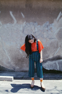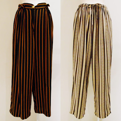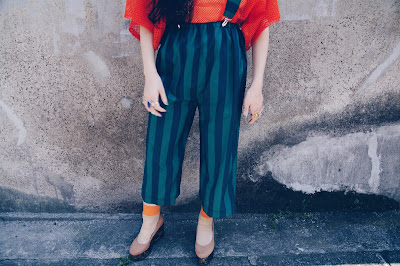 サスペンダー付き、太幅のストライプと遊びの効いたデザインながらも、