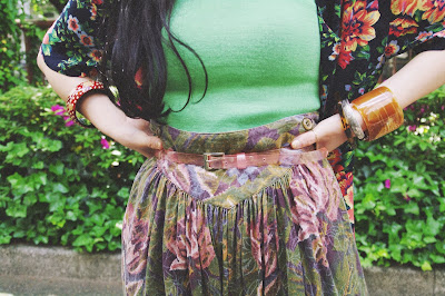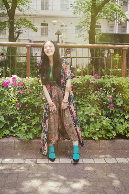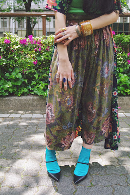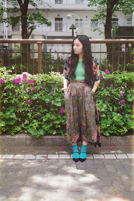 合わせたワイドパンツは、かすれたような花柄と絶妙なくすんだような色味が