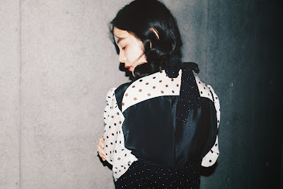 ドット柄とブラックの2種類の異なる素材を組み合わせたブラウスは、