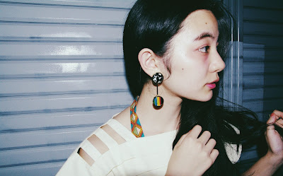 表情の異なる2種類のアクリルパーツを組み合わせたイヤリング。