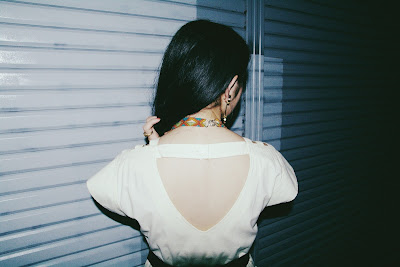 大きくカットされたバックに白いボタンが可愛いらしい印象です*