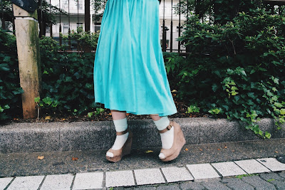 下に合わせたのは、綺麗なミントカラーのプリーツスカート。
