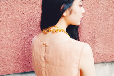 VINTAGE NECKLACEをたっぷりと重ね付け。