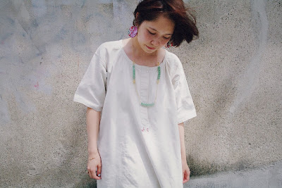 シンプルなスタイリングにWind bell earingsを身に付け