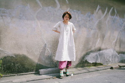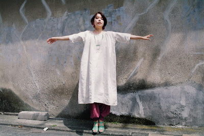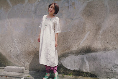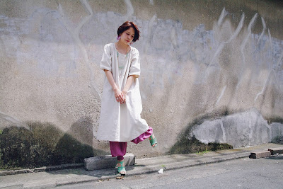 リネンのワンピースにバスケットバッグなんかさげて