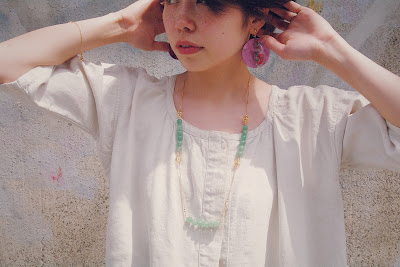 首元には繊細な装飾のチェーンと直線的な天然石ビーズのコントラストが