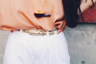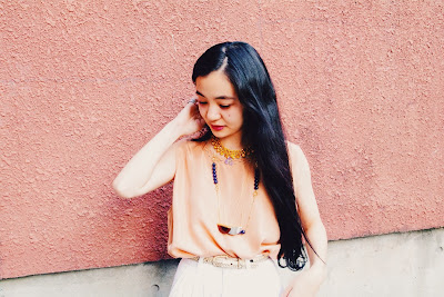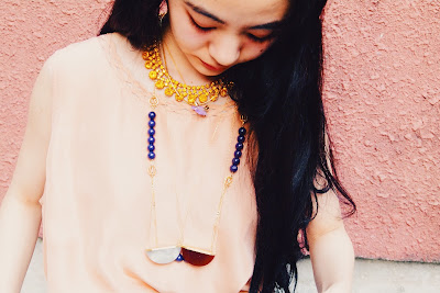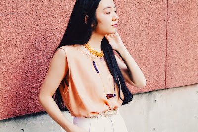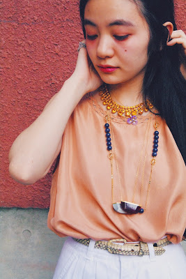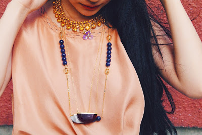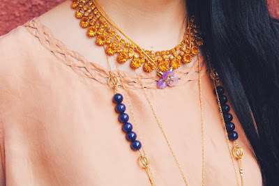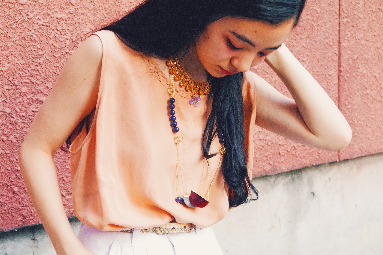 VINTAGE NECKLACEをたっぷりと重ね付け。
