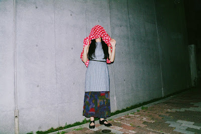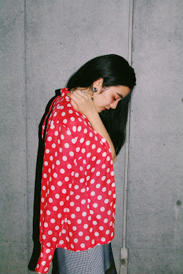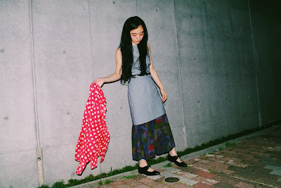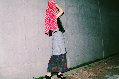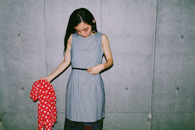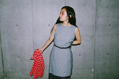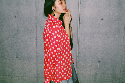 ぱきっと明るいレッドのブラウスは肩から羽織ったり、手に持つだけでも