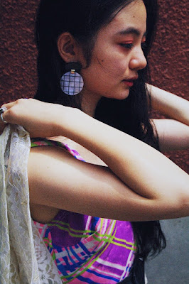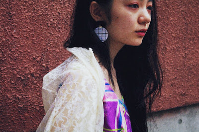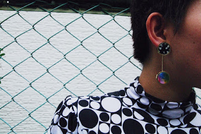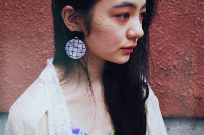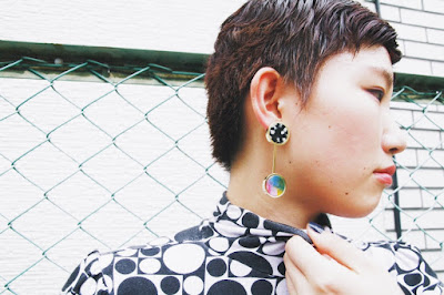 表情の異なる2種類のアクリルパーツを組み合わせたSusie earringsを。