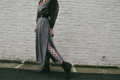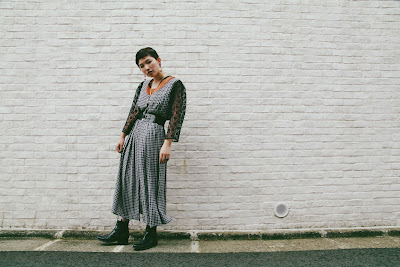 スリットからはドット柄をちらりと覗かせてコーディネートにポイントを*