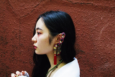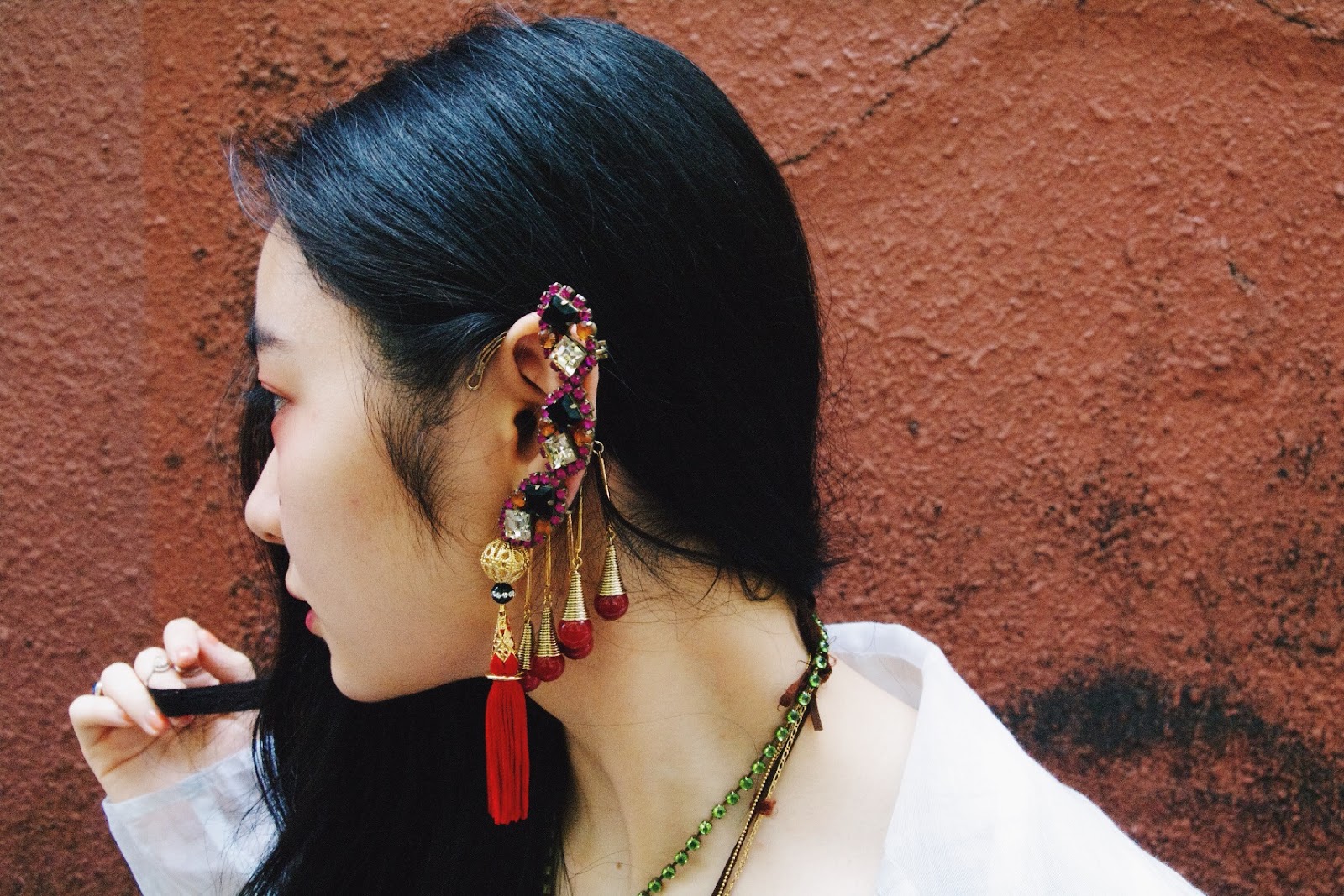 レッド系のイヤーフックとイヤーカフを組み合わせました。