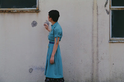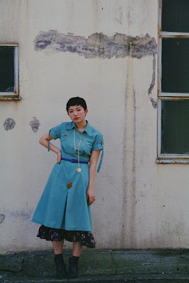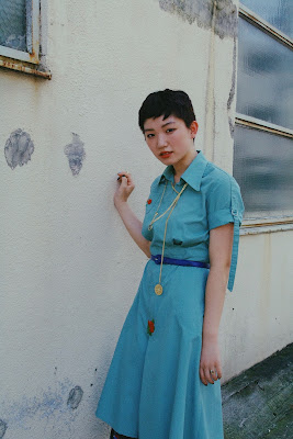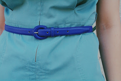 ワンピースとベルトの涼しげなカラーの組み合わせは夏に向けて