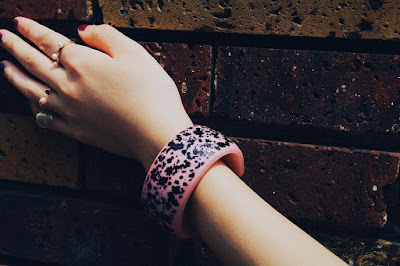 アクリルにレーザーで彫り色をつけたPOLLOCK BANGLEは、