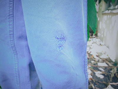 作業着として愛用されていたであろう面影が感じられるペンキの跡やほつれをかがった跡、