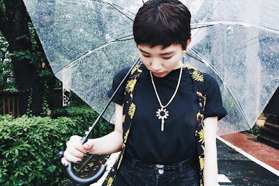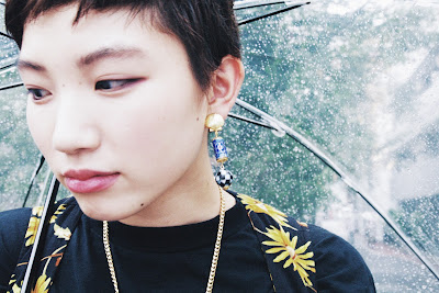 直線と曲線の組み合わせと、耳元で揺れるカラフルながらも落ち着いた色合いが