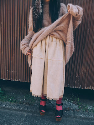 大きなポケットが印象的なスカートは、秋冬らしい起毛した素材。