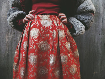 レッド×金糸刺繍がなんともおめでたい雰囲気のスカート。