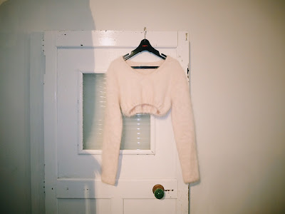 ベビーピンクが可愛らしいニットは超ショート丈。