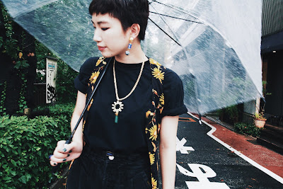 直線と曲線の組み合わせと、耳元で揺れるカラフルながらも落ち着いた色合いが